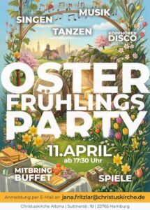 Wir feiern nochmal Ostern! Und den Frühling! Am 11.April, ab 17:30 Uhr! Spiele, Musik, Tanz, Kopfhörer-Disko und leckeres Essen! Ein gemeinsamer Spätnachmittag und Abend voller guter Laune und netter Leute! Oster- und Frühlings-Stimmung inklusive. Eine Anmeldung ist gewünscht. Bitte mailen an jana.fritzlar@nullchristuskirche.de oder Jana höchstpersönlich ansprechen!