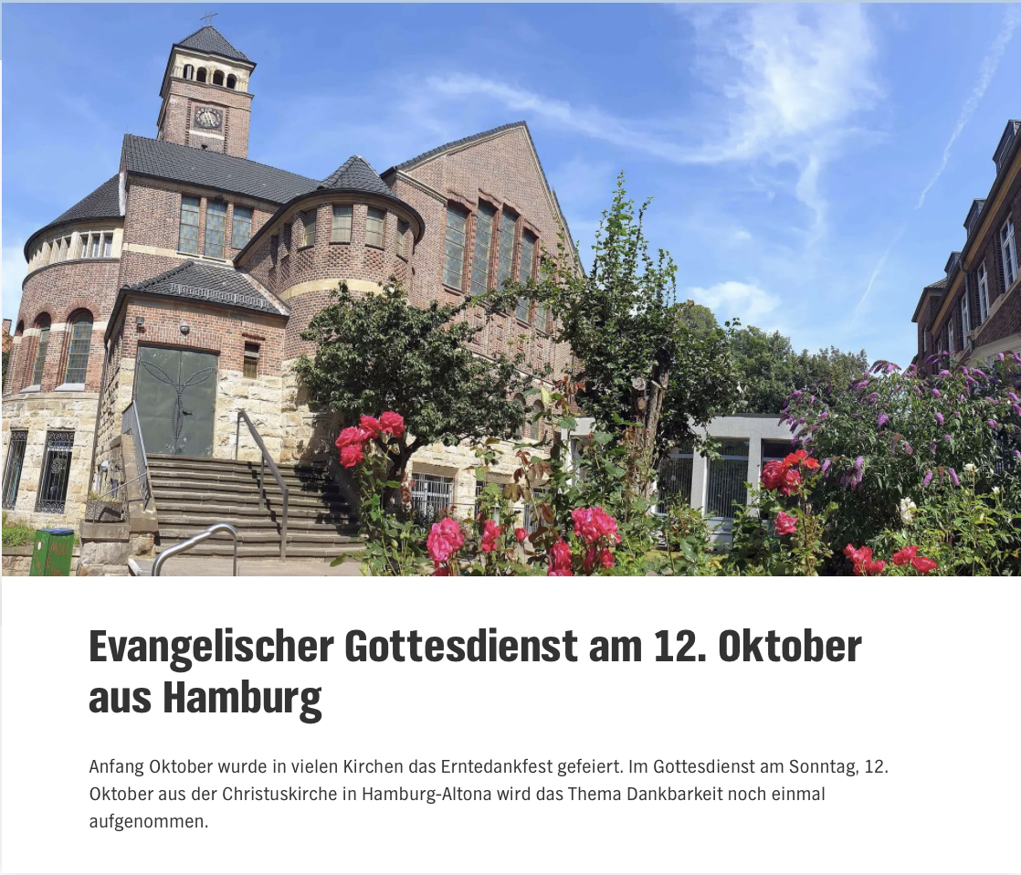 Das war ein dankbarer Gottesdienst! Wenn du ihn nachhören möchtest, dann geht das hier! Wenn du ihn hören und sehen möchtest, dann geht das hier! Am Sonntag, 12.Oktober 2025, wird unser Gottesdienst im Radio übertragen (NDR und WDR). Gemeindemitglieder und Freunde/Freundinnen der Gemeinde werden gebeten, nicht zuhause vor dem Radio zu bleiben, sondern bereits um…
