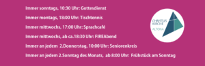 Die ChristuskircheGottesdienstPredigt vorbereiten und mitdenkenSprachcaféFIREAbendSchönen guten AbendMehr als MusikKinderkircheSeniorentreffHauskreiseTischtennisRückwandMöchtest du mitarbeiten?Vernetzung