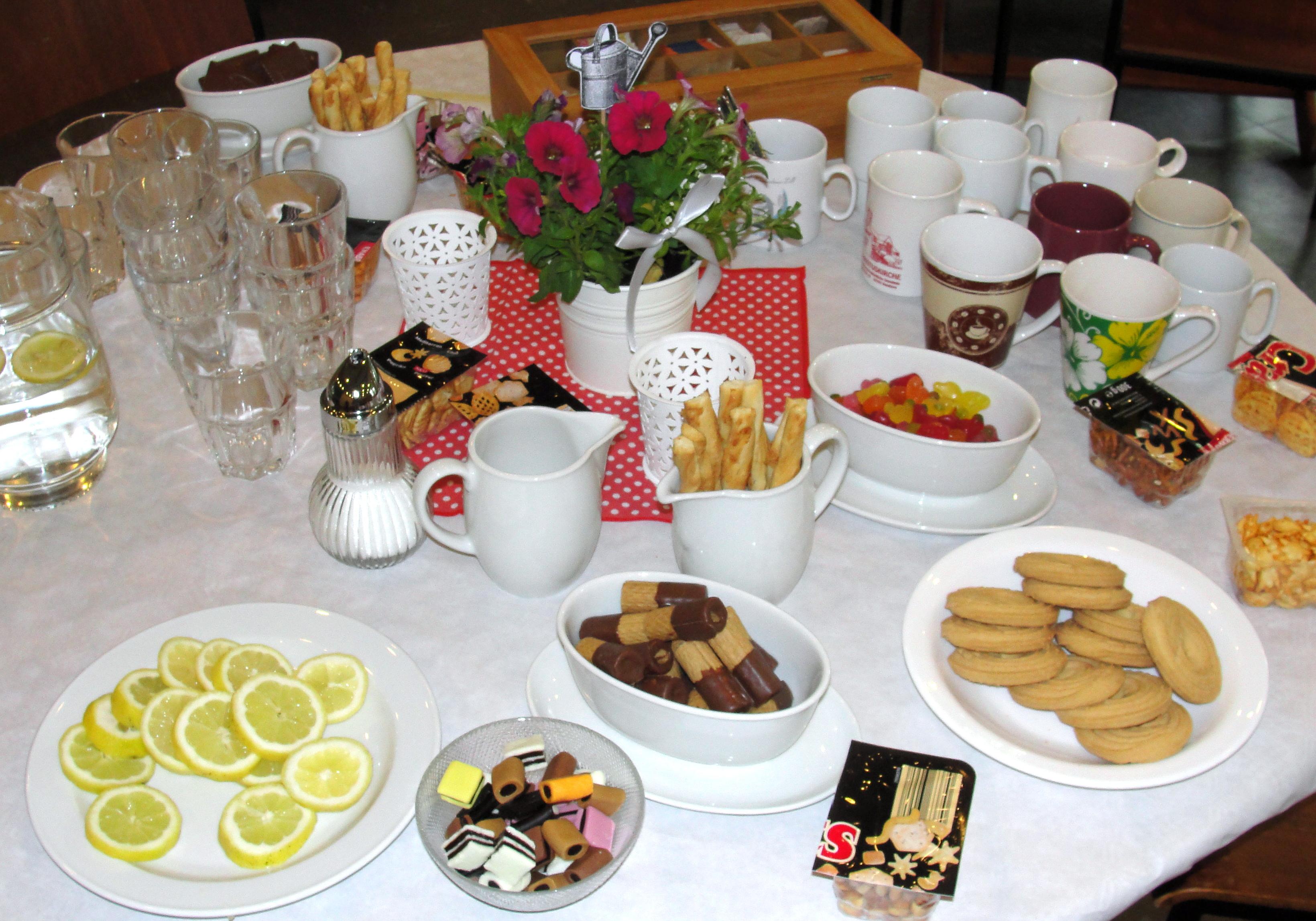 Vorlagen und Inspirationen warteten auf einem langen Tisch, dahinter hingen Girlanden als Beispiele. Zu jedem Thema hatten wir vorher Einladungs- und Dankeskarten angefertigt, Tischkärtchen und Serviettenringe gebastelt, Dekorationen erstellt und Geschenkverpackungen ausgedacht. Vielfältiges Material wie Stempel, Stanzen, dekorative Elemente, viele Bänder und Schleifen warteten auf ihren Einsatz. Pappen, Transparentpapier und Motivpapiere wurden zu abwechslungsreichen Unikaten verarbeitet. Jede Station bestand aus einem anderen Arbeitstisch, wo die passenden Schablonen zum Thema zu finden waren: Hier wurden Karten angefertigt, dort Geschenkverpackungen oder Dekorationen für das Fest. Ein Tisch mit Erfrischungen und Snacks stand für eine kleine Pause zwischendurch bereit.