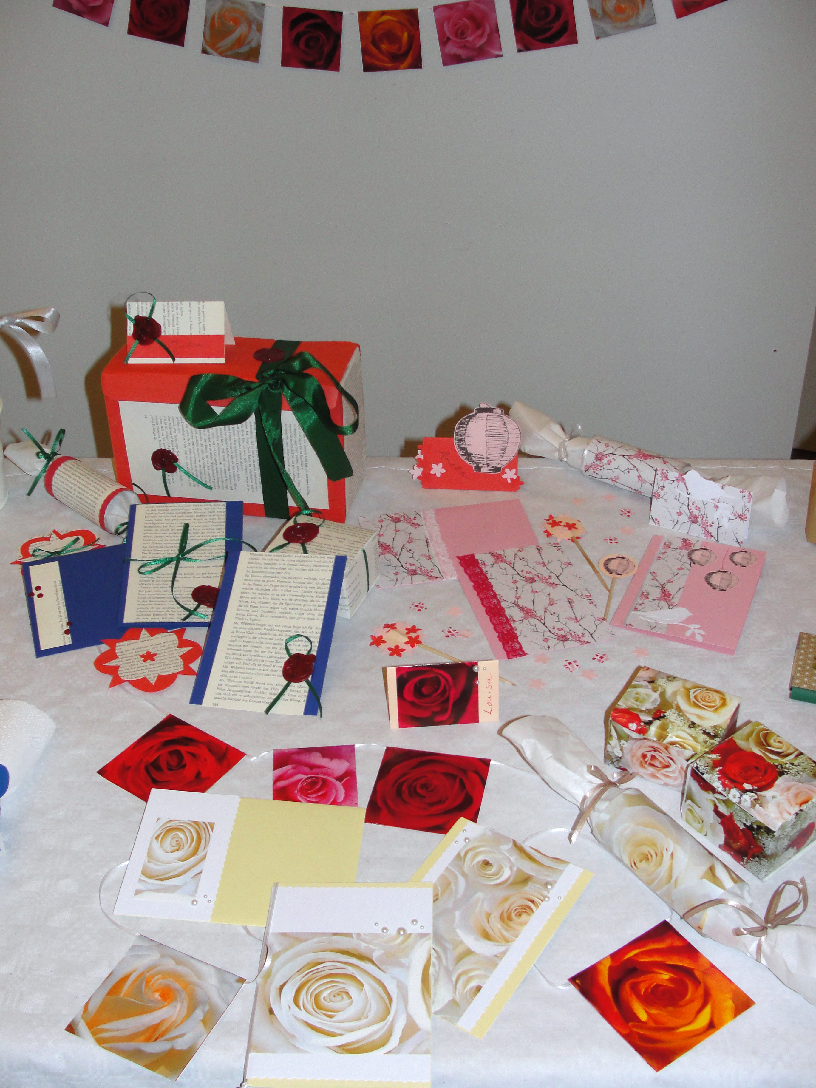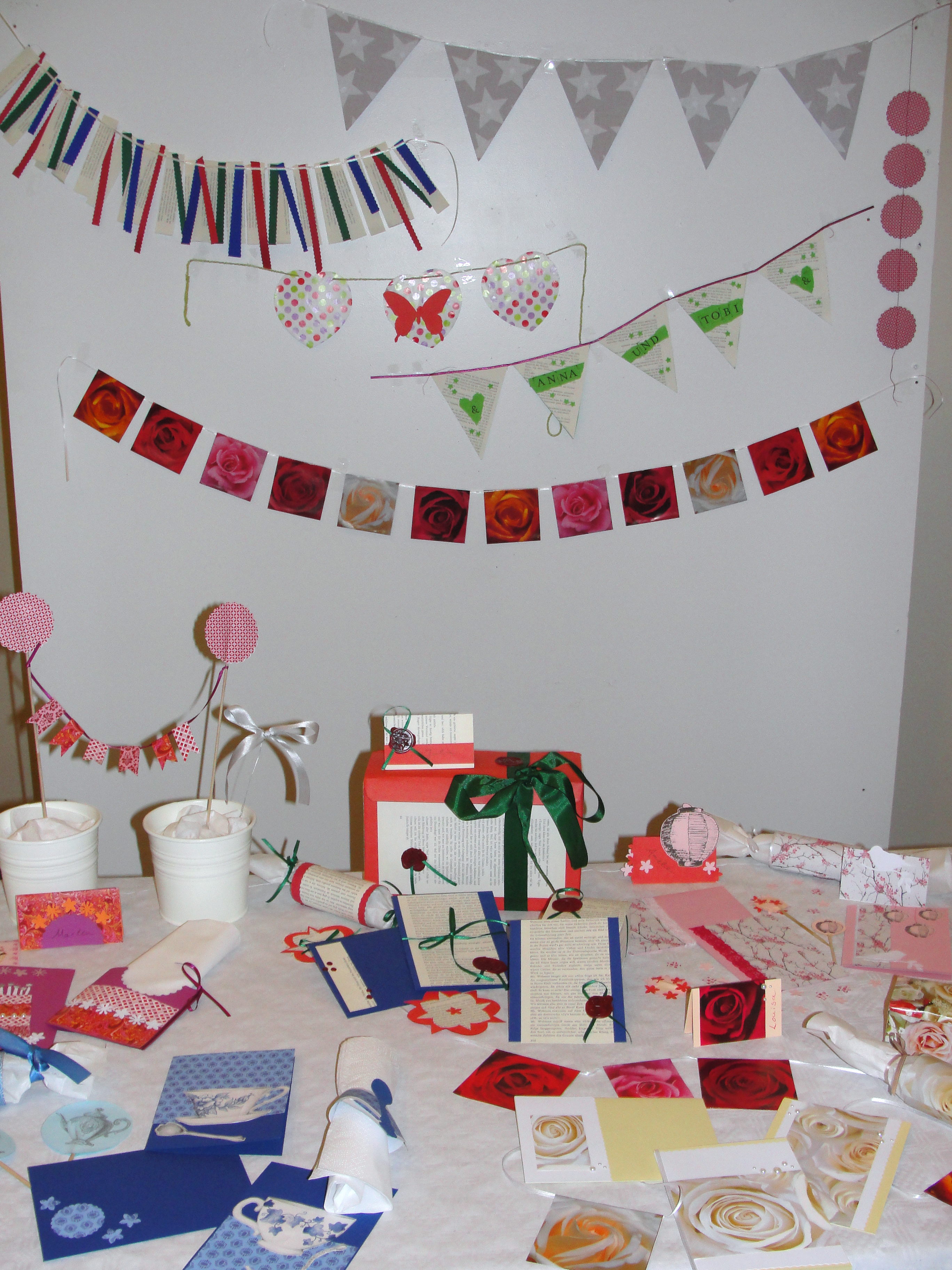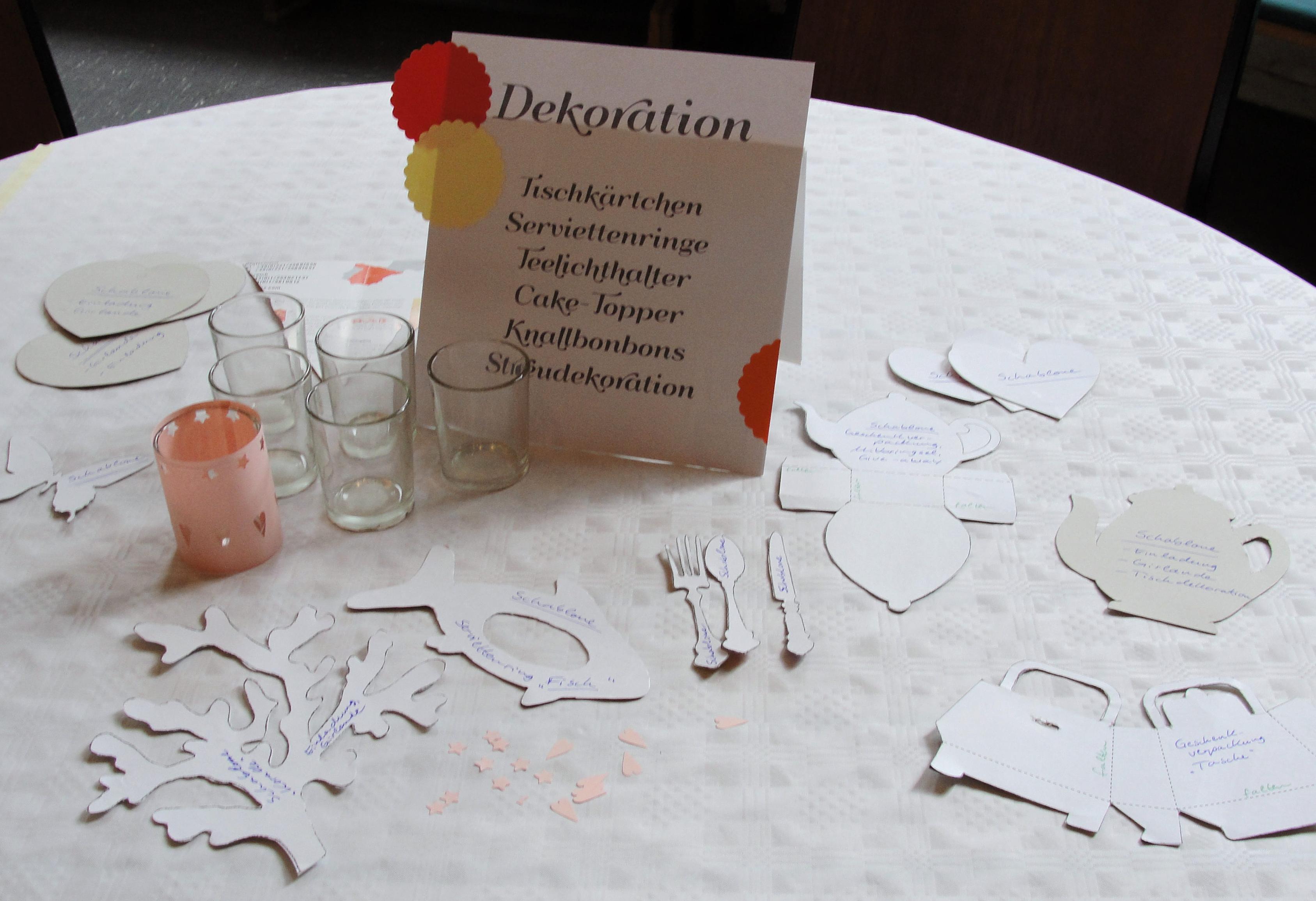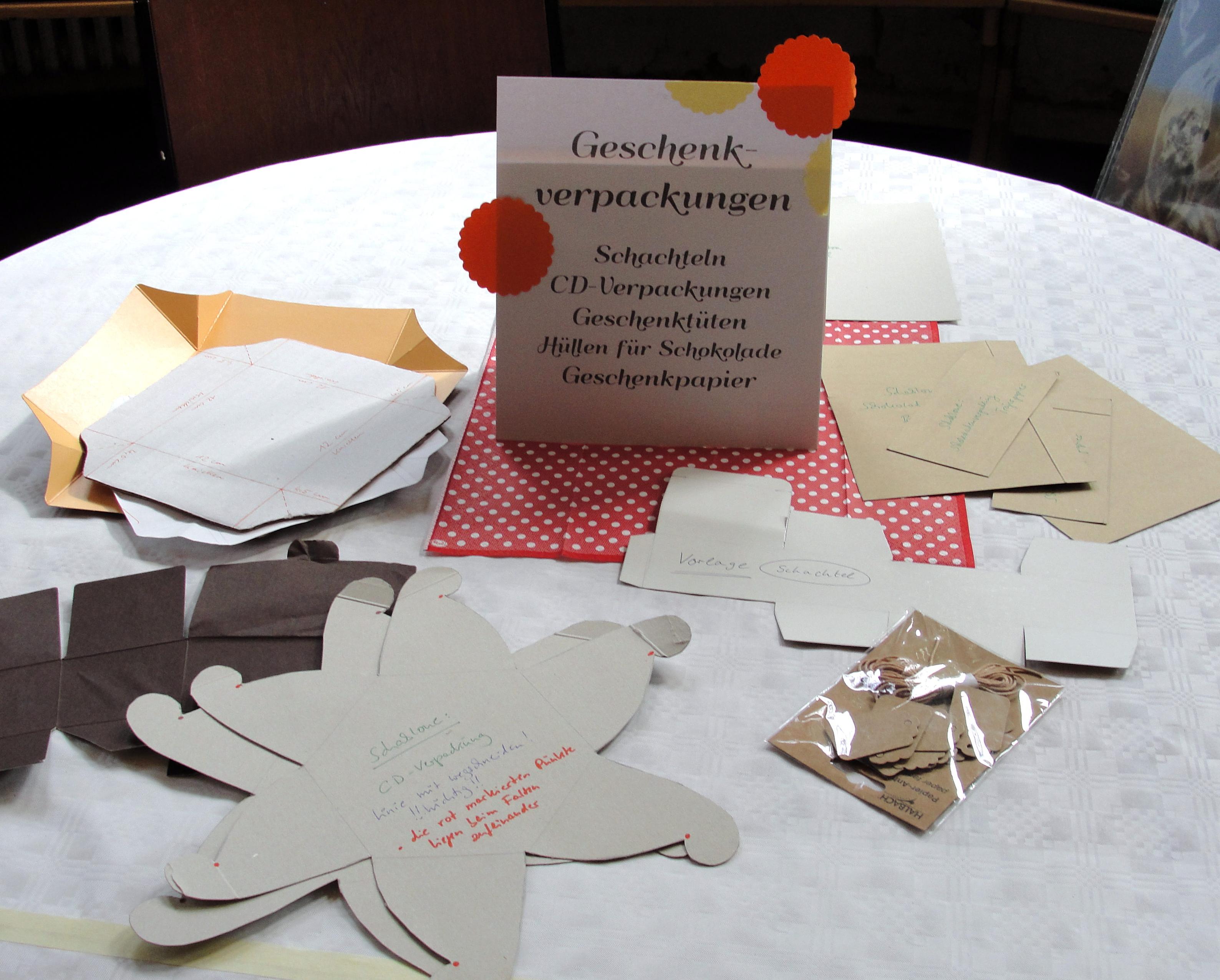 Vorlagen und Inspirationen warteten auf einem langen Tisch, dahinter hingen Girlanden als Beispiele. Zu jedem Thema hatten wir vorher Einladungs- und Dankeskarten angefertigt, Tischkärtchen und Serviettenringe gebastelt, Dekorationen erstellt und Geschenkverpackungen ausgedacht. Vielfältiges Material wie Stempel, Stanzen, dekorative Elemente, viele Bänder und Schleifen warteten auf ihren Einsatz. Pappen, Transparentpapier und Motivpapiere wurden zu abwechslungsreichen Unikaten verarbeitet. Jede Station bestand aus einem anderen Arbeitstisch, wo die passenden Schablonen zum Thema zu finden waren: Hier wurden Karten angefertigt, dort Geschenkverpackungen oder Dekorationen für das Fest. Ein Tisch mit Erfrischungen und Snacks stand für eine kleine Pause zwischendurch bereit.
