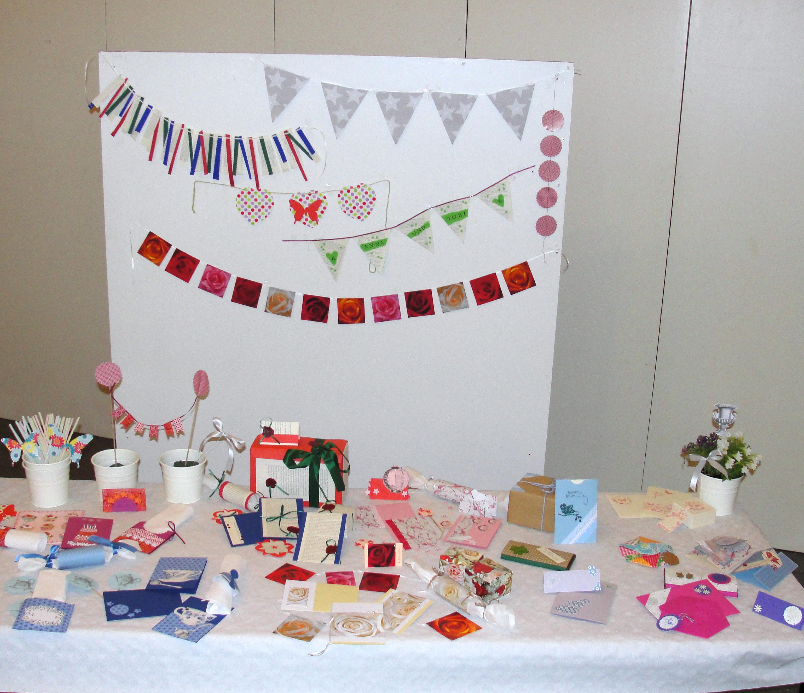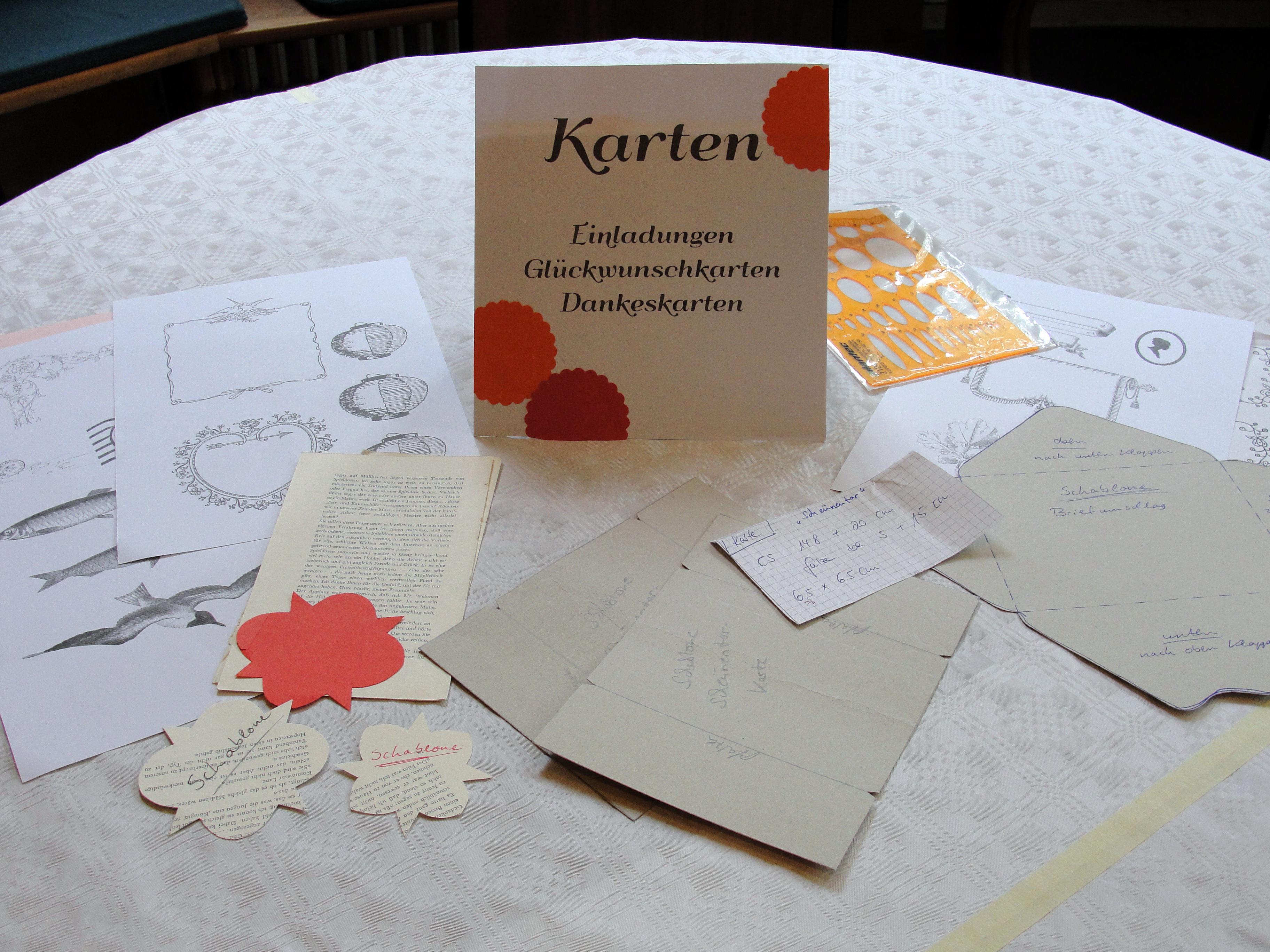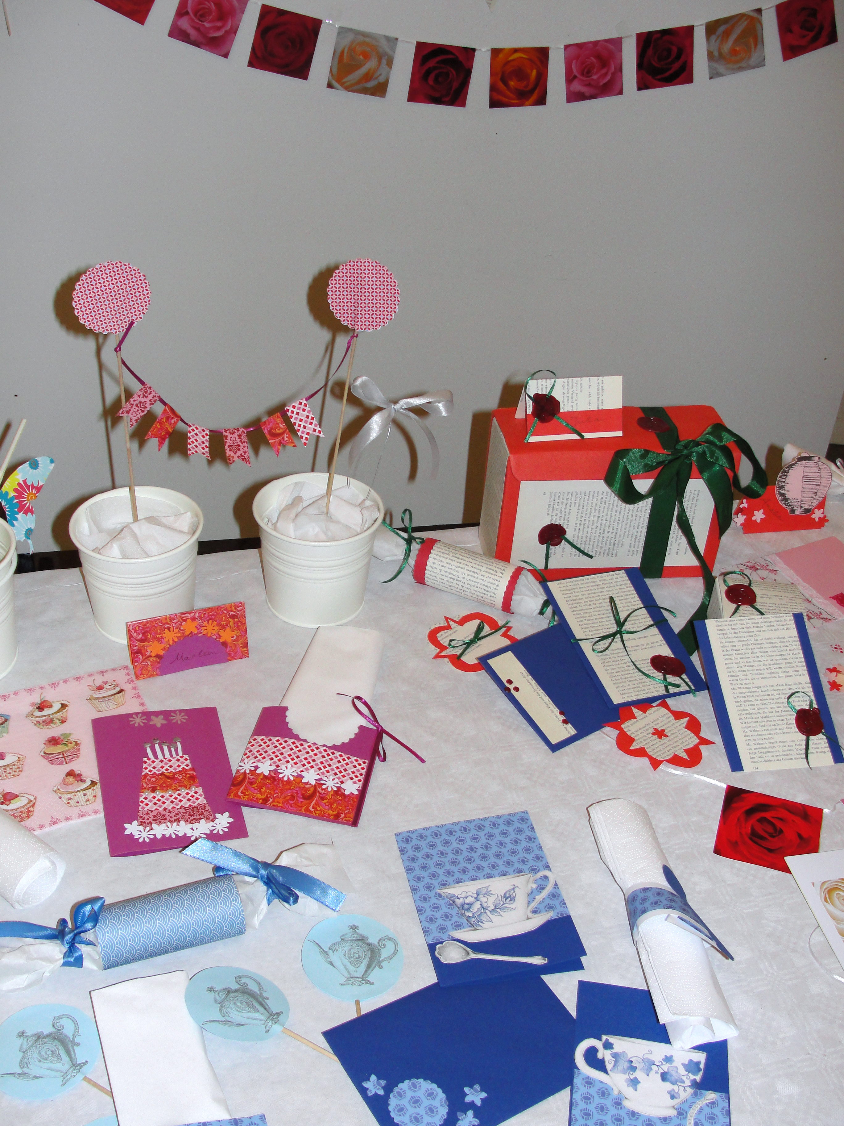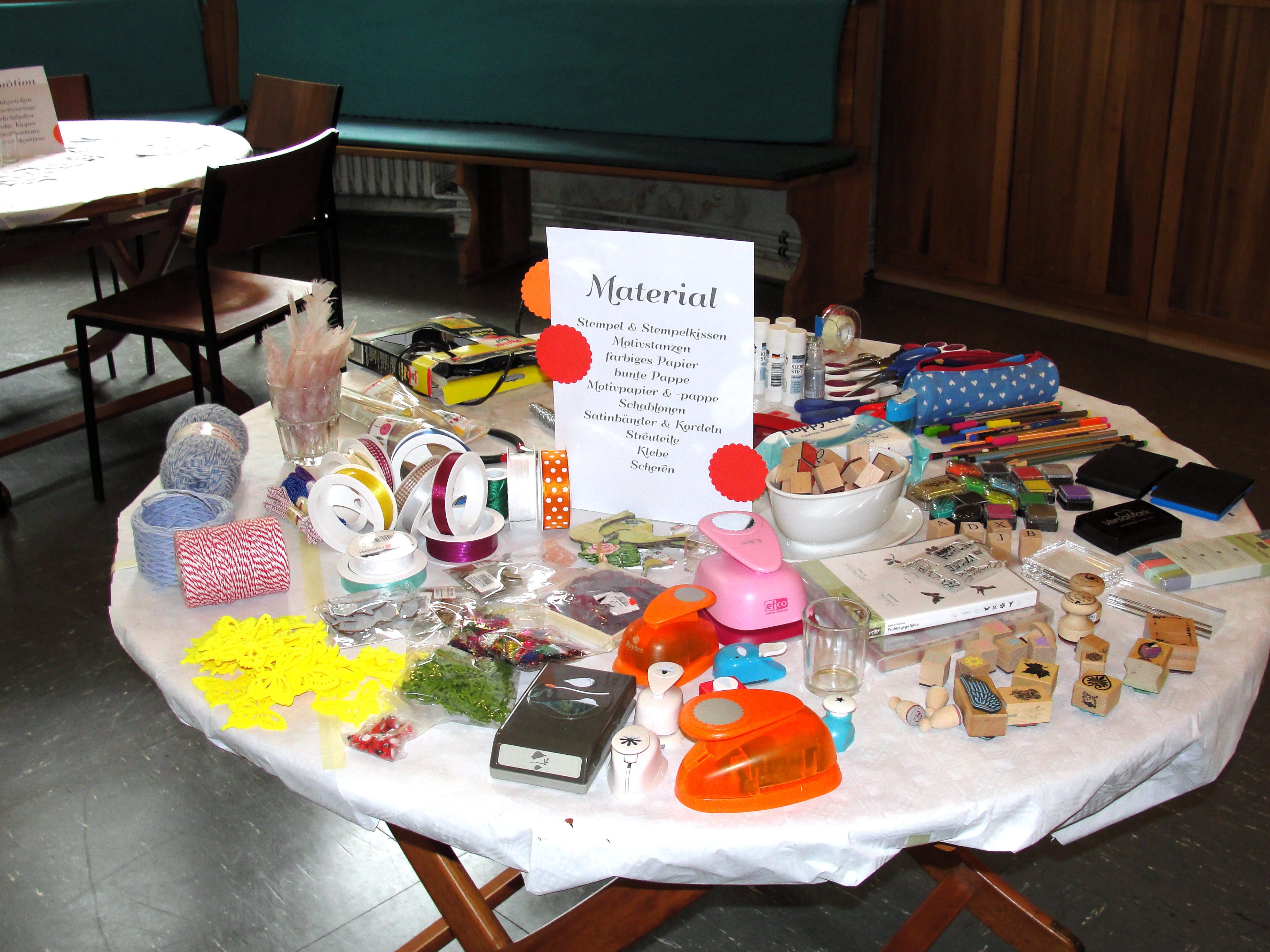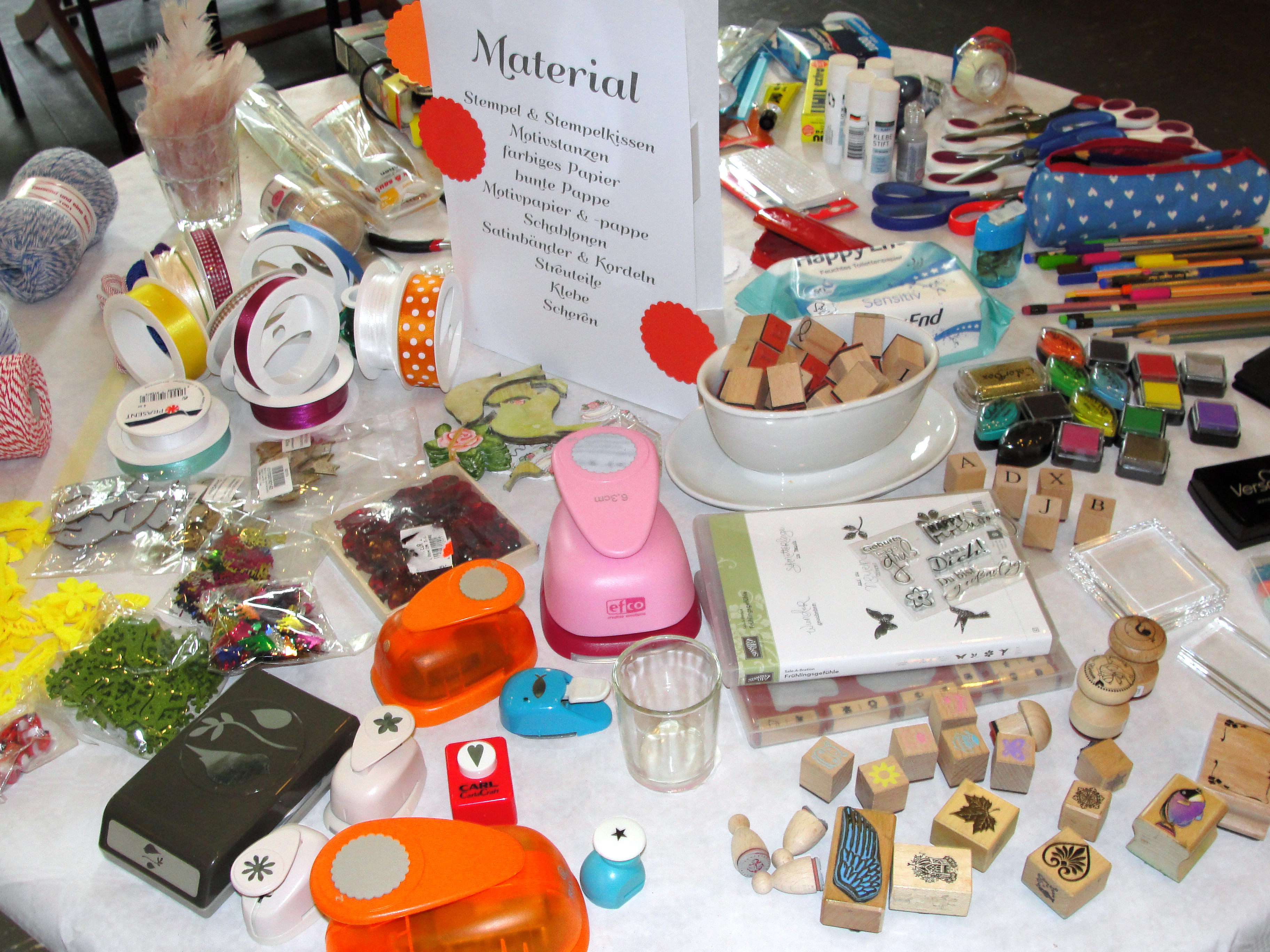 Vorlagen und Inspirationen warteten auf einem langen Tisch, dahinter hingen Girlanden als Beispiele. Zu jedem Thema hatten wir vorher Einladungs- und Dankeskarten angefertigt, Tischkärtchen und Serviettenringe gebastelt, Dekorationen erstellt und Geschenkverpackungen ausgedacht. Vielfältiges Material wie Stempel, Stanzen, dekorative Elemente, viele Bänder und Schleifen warteten auf ihren Einsatz. Pappen, Transparentpapier und Motivpapiere wurden zu abwechslungsreichen Unikaten verarbeitet. Jede Station bestand aus einem anderen Arbeitstisch, wo die passenden Schablonen zum Thema zu finden waren: Hier wurden Karten angefertigt, dort Geschenkverpackungen oder Dekorationen für das Fest. Ein Tisch mit Erfrischungen und Snacks stand für eine kleine Pause zwischendurch bereit.