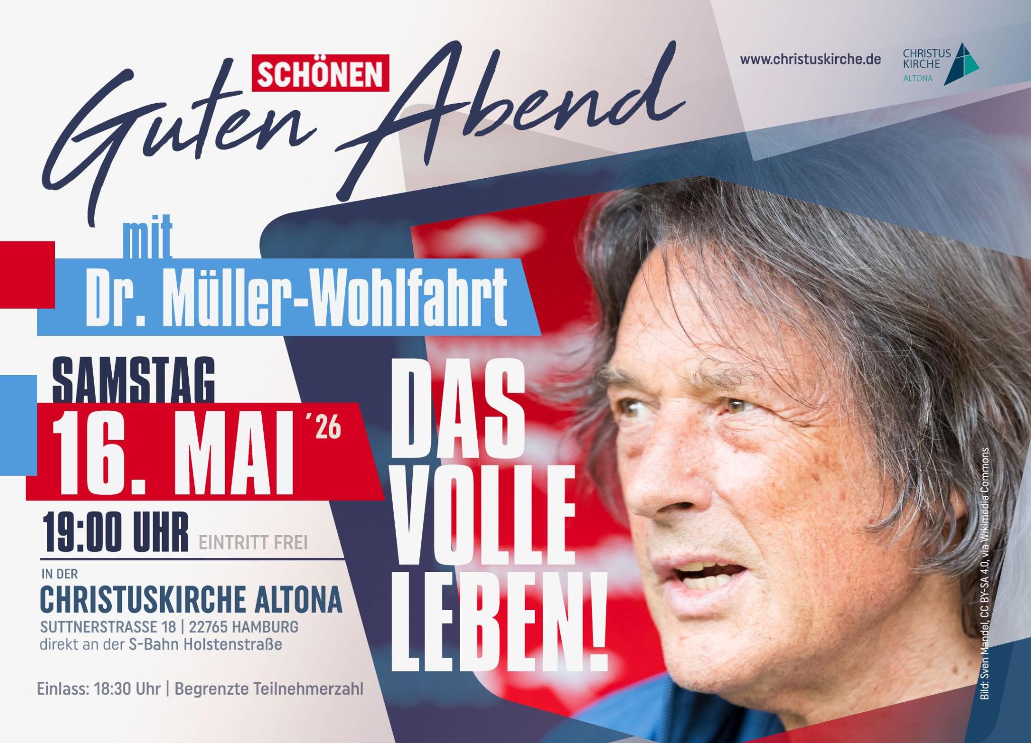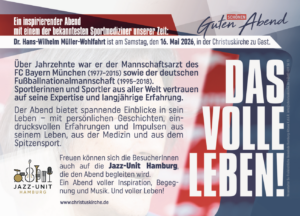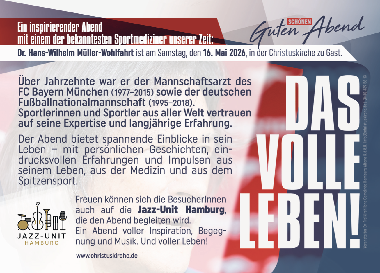 Ein inspirierender Abend mit einem der bekanntesten Sportmediziner unserer Zeit:  Dr. Hans-Wilhelm Müller-Wohlfahrt ist am Samstag, den 16. Mai 2026, in der Christuskirche zu Gast.Einlass: 18:30 Uhr